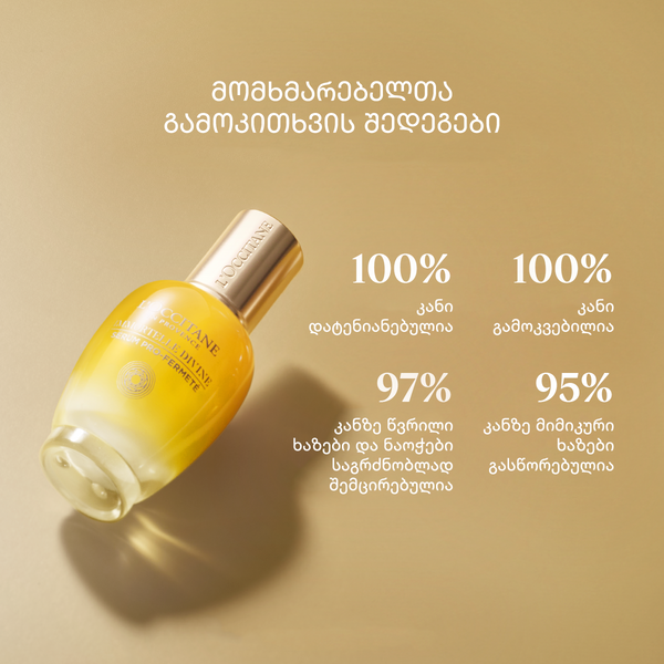 Notice visible efficacy on: wrinkles, firmness, evenness, volume, and vibrancy. The lightweight gel-cream texture melts into the skin to help improve the benefits of our anti-aging Immortelle Divine Cream. Over time, the serum helps visibly reduce the appearance of wrinkles and helps the skin feel firmer and more elastic. Skin’s complexion looks more even toned and appears brighter.