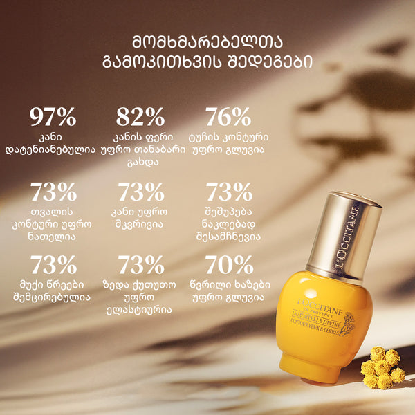 The L'Occitane en Provence teams discovered the antioxidant and anti-ageing properties of this essential oil from Corsica. It acts (helps) against the loss of firmness of the skin and reduces the appearance of wrinkles. -